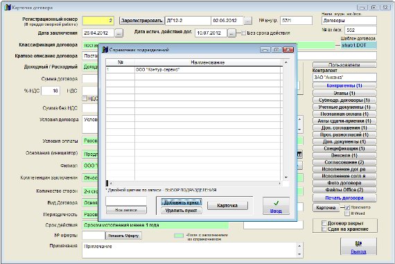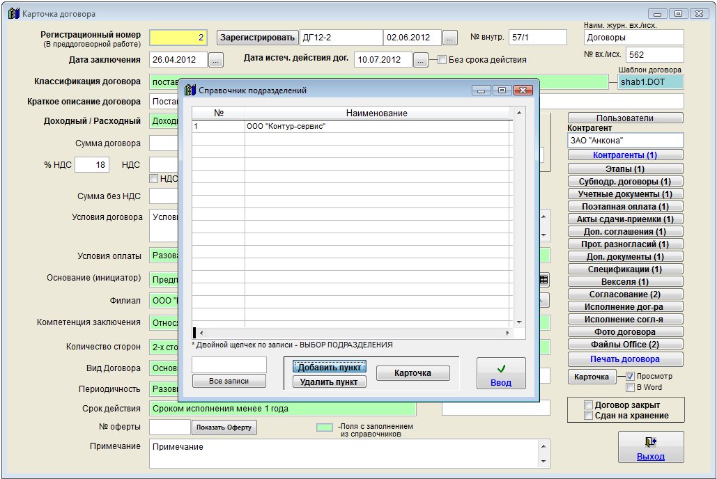 Филиал можно добавить непосредственно при заполнении карточки договора (поля Филиал).