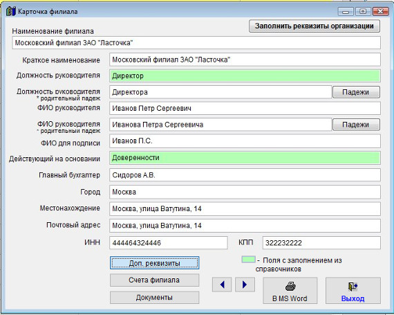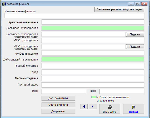 Для ввода филиала выберите пункт меню "Справочники-Филиалы".