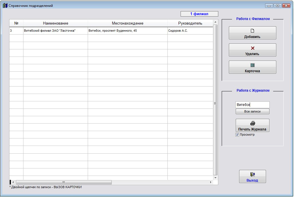 Для поиска филиала выберите пункт меню "Справочники-Филиалы".
