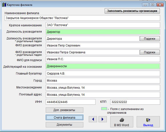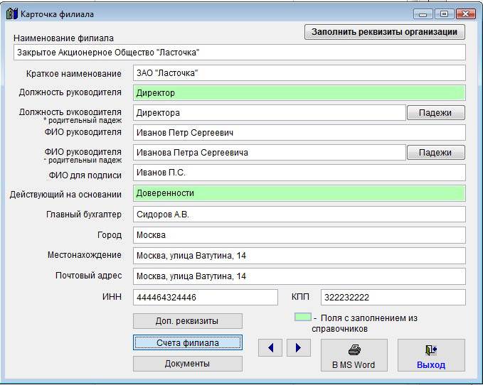 Для введения информации о счетах филиала в карточке филиала нажмите кнопку "Счета филиала".