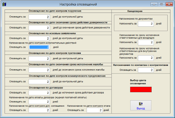 Для задания количества дней, за которое до текущей даты срабатывает оповещение по искам выберите пункт меню "Сервис-Настройка оповещений".