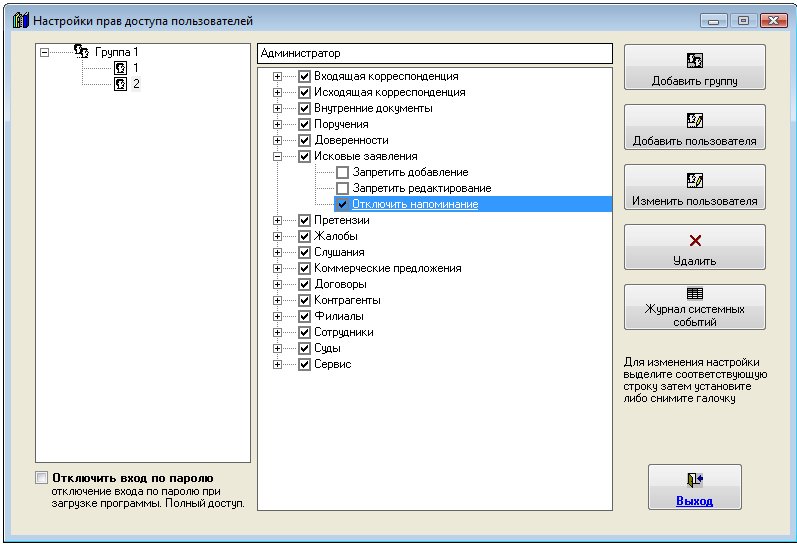 Откроется окно "Настройки прав доступа пользователей".