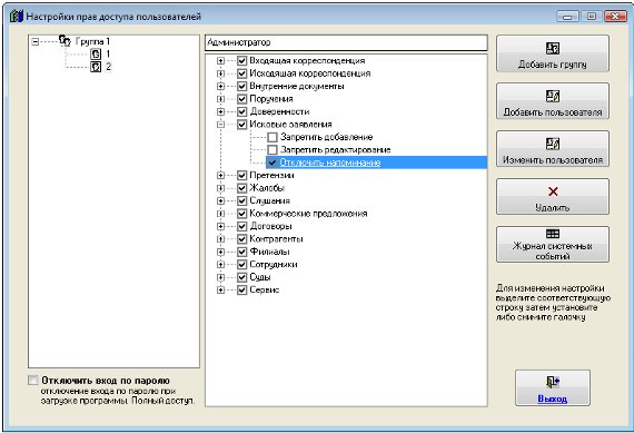 В случае, если включен вход по паролю в программу (галочка "Отключить вход по паролю" в "Настройках прав доступа пользователей" снята),