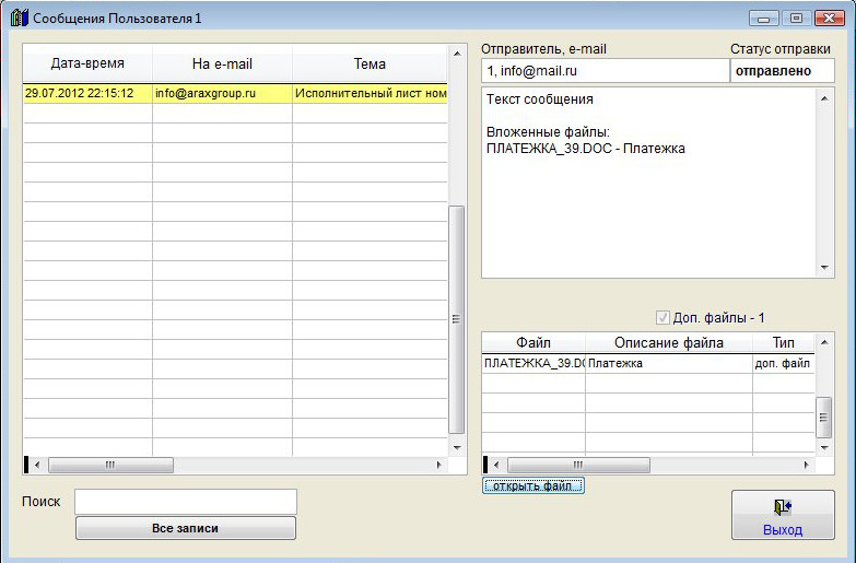 В архиве сообщений можно осуществлять поиск, видеть реквизиты сообщений и статус отправки, имеется возможность просмотра файлов вложений.