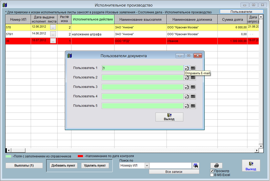 Для отправки уведомления по e-mail Пользователю исполнительного листа надо открыть раздел "Пользователи" справа над таблицей в журнале исполнительных листов.