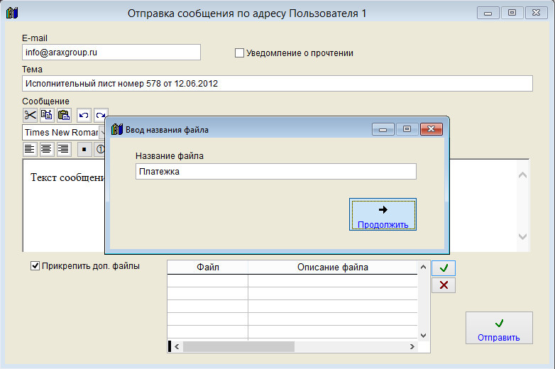 В окне "Ввод названия файла" введите имя прикрепляемого файла и нажмите кнопку "Продолжить".
