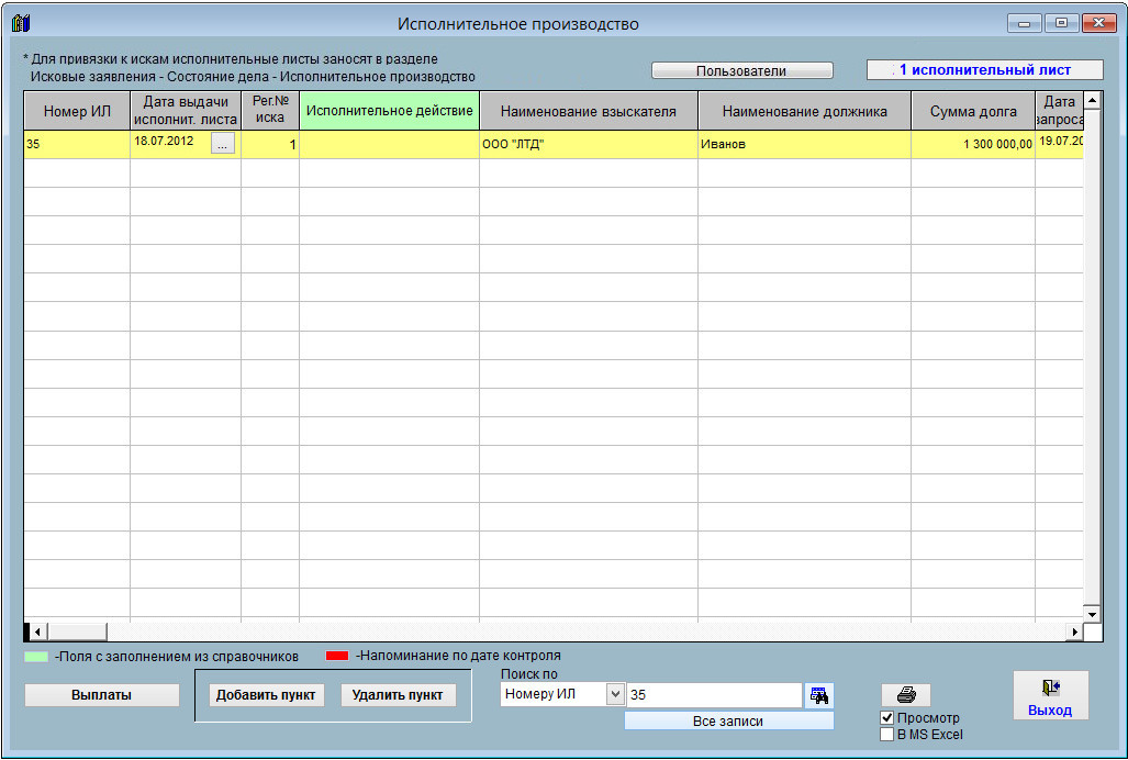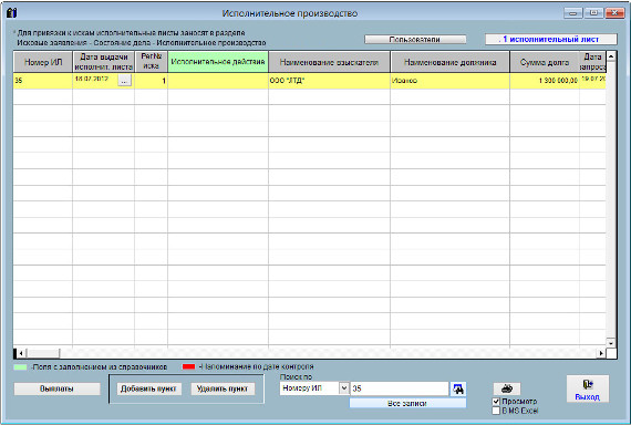 В поле поиска введите нужный номер исполнительного листа и нажмите на кнопку с изображением бинокля, в журнале исполнительных листов отобразятся исполнительные листы с введенным в поле поиска номером.