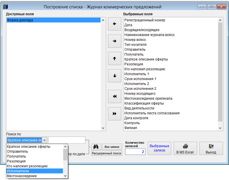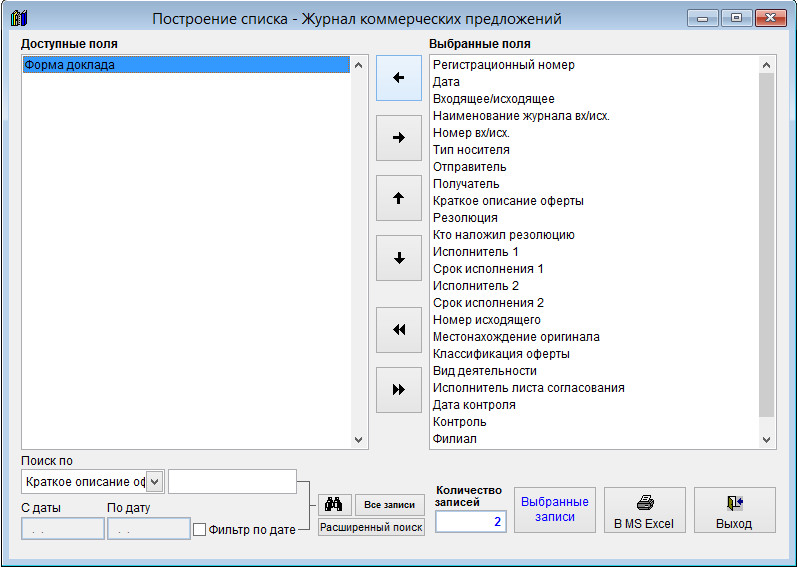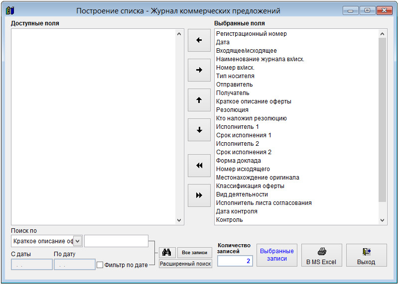 С помощью галочек в столбце "Выбрать" можно дополнительно снять галочки с тех записей, которые не требуется выводить в MS Excel (OO Calc).