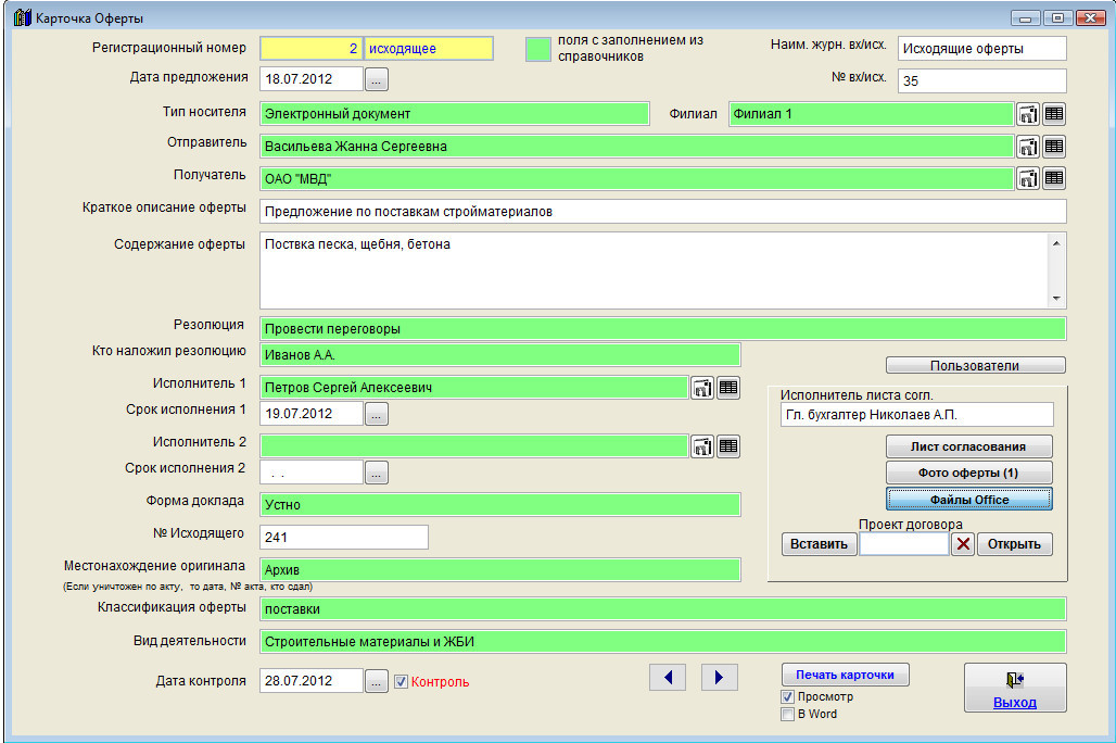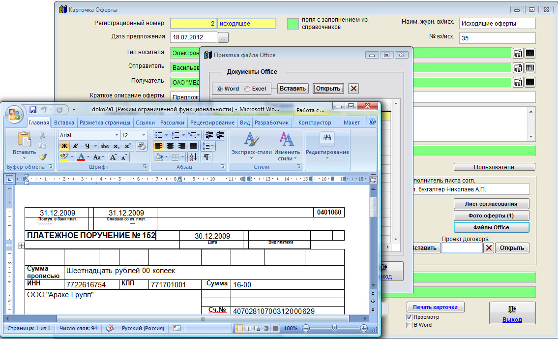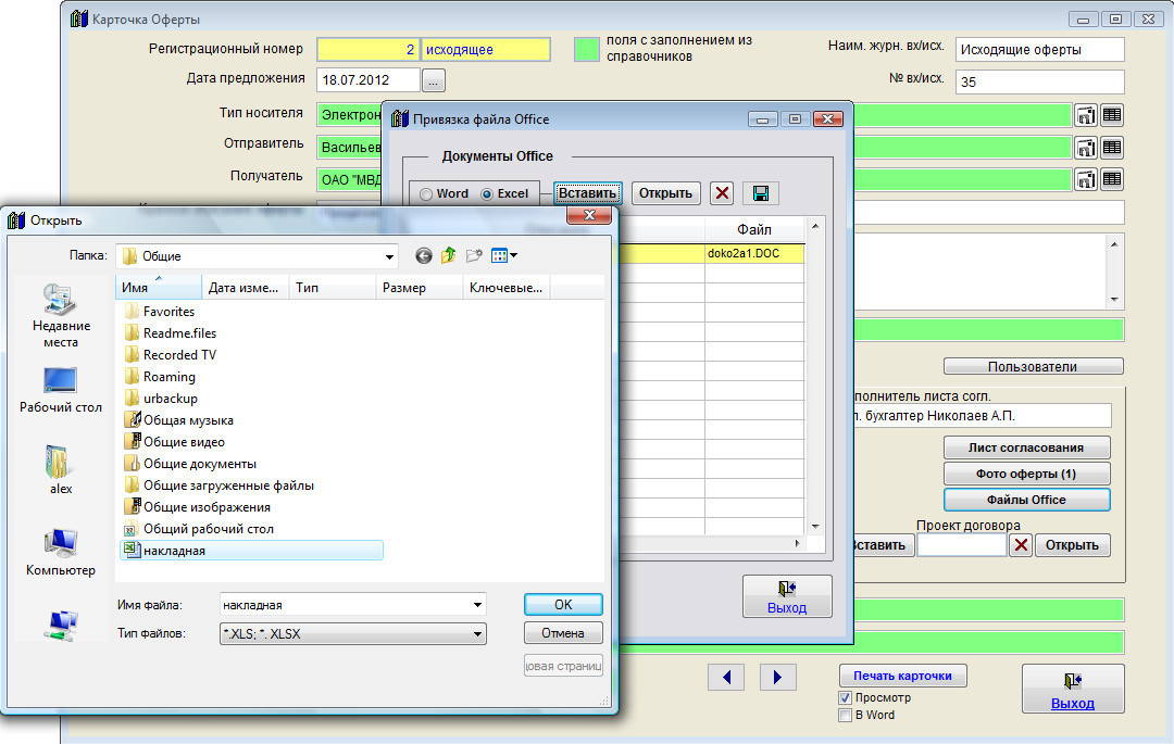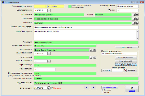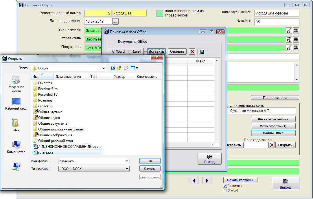 Для прикрепления файлов Word и Excel нажмите кнопку "Файлы Office" в карточке коммерческого предложения (в группе кнопок в правой части карточки).