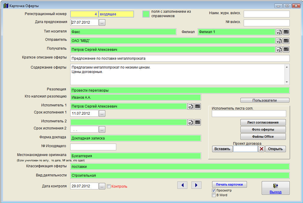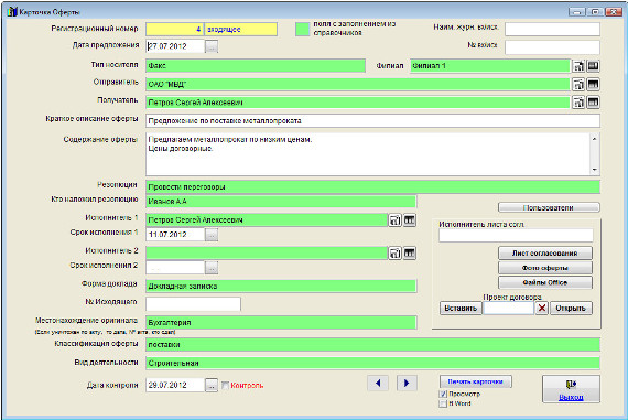 Внесите нужные изменения в карточку коммерческого предложения, после внесения изменений нажмите кнопку "Выход".