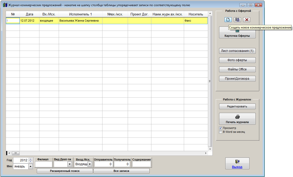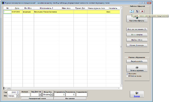 Для добавления нового коммерческого предложения в журнал нажмите кнопку "Создать новое коммерческое предложение" с изображением чистого листка в правом верхнем углу формы журнала коммерческих предложений.