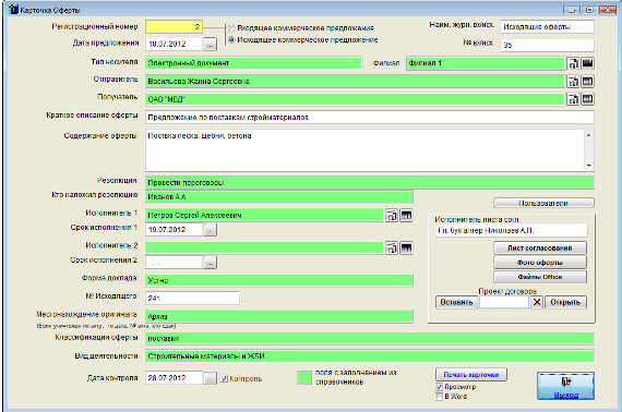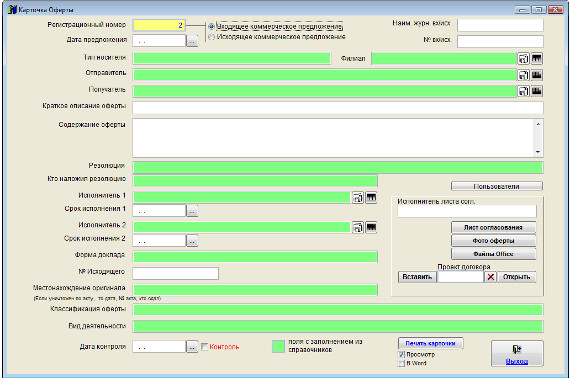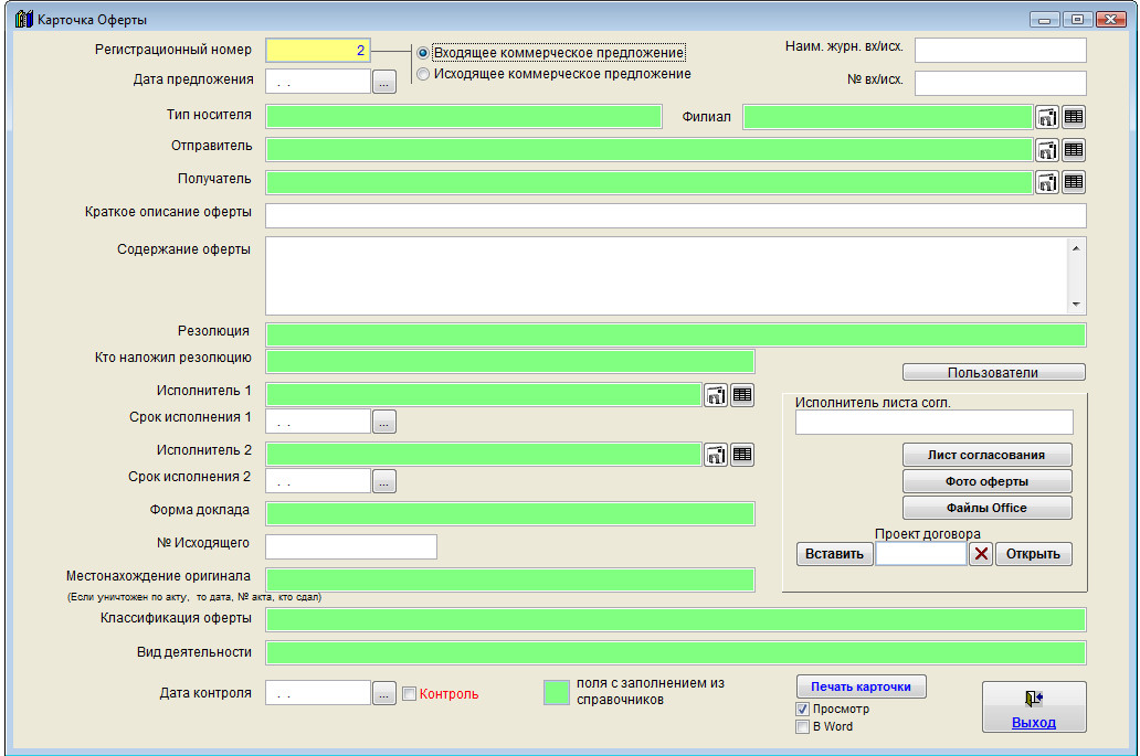 Выберите входящее или исходящее коммерческое предложение и заполните нужные поля в карточке коммерческого предложения.