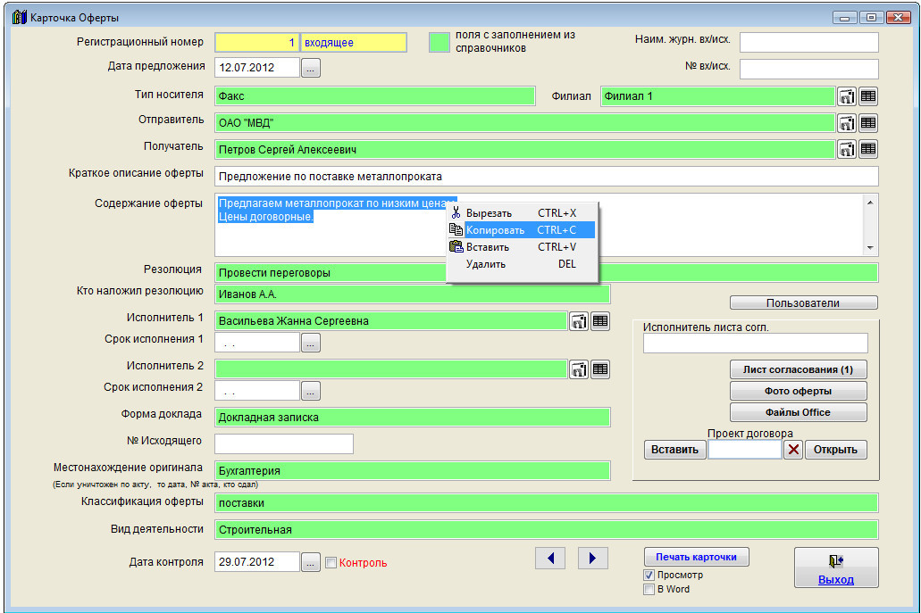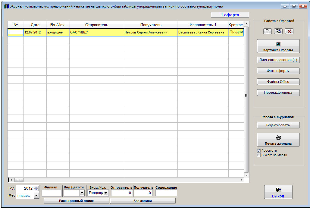 В журнале коммерческих предложений можно добавлять и удалять записи, редактировать карточку коммерческого предложения, прикреплять к карточке коммерческого предложения отсканированные копии документов, файлы и приложения, упорядочивать записи по любому столбцу, осуществлять поиск по журналу, выводить журнал на печать, печатать различные отчеты по журналу, отправлять уведомления по e-mail лицам, имеющим отношение к коммерческому предложению.