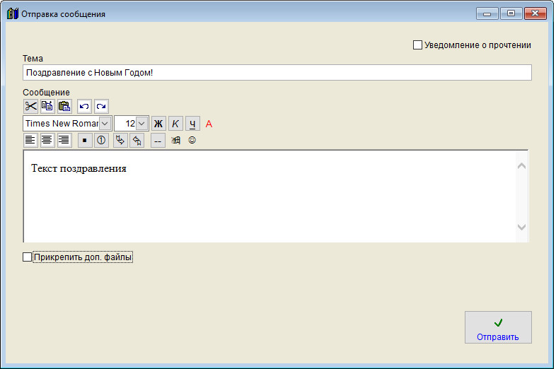 При необходимости текст можно отформатировать, выделить цветом, вставить в ссылку или изображение (кнопка с изображением смайлика) непосредственно в тело письма. Вставляемое данной кнопкой (с изображением смайлика) изображение будет отправлено получателю письма, но не будет скопировано в базу, в базе будет сохранена локальная ссылка на такое изображение, если нужно, чтобы данные изображения были доступны из базы, вставлять их надо с общего ресурса, подключенного с одинаковым именем.