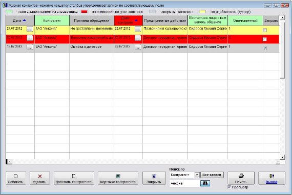 В журнале контактов отобразятся контакты, соответствующие условию поиска, т.е. контакты с контрагентом "Анкона"
