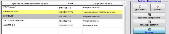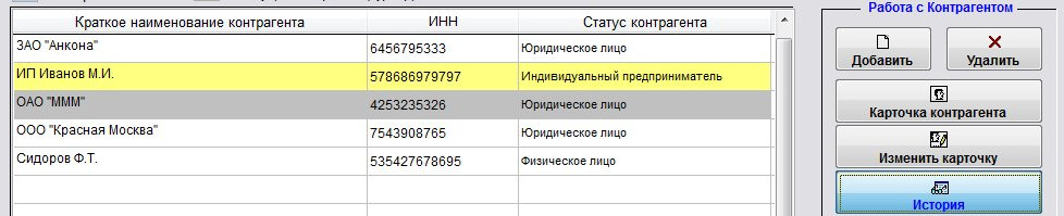 Мышью установите курсор на нужного контрагента (контрагент выделится желтым) и нажмите кнопку "История" в правой части формы.