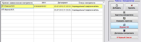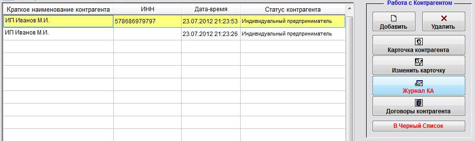 В журнале контрагентов отобразятся записи истории данного контрагента.