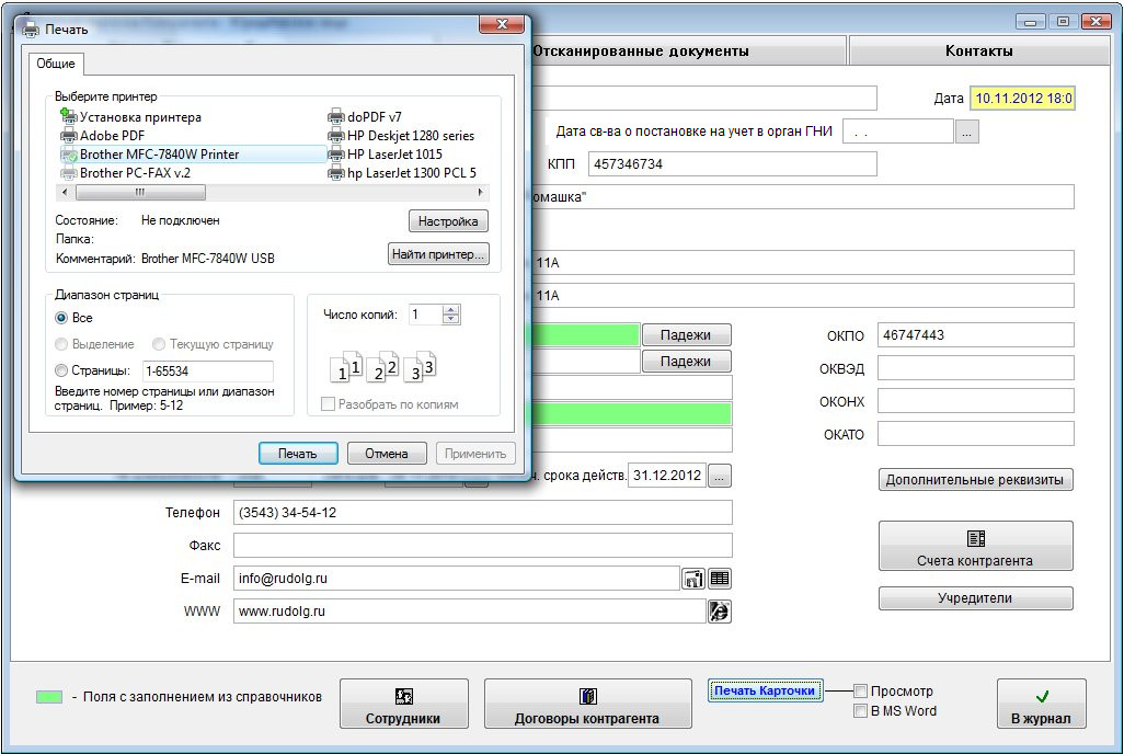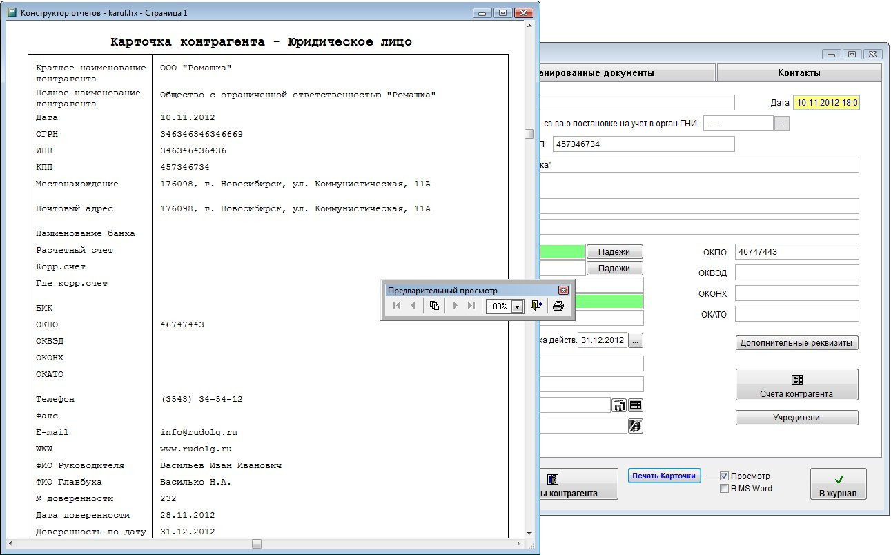 Для вывода карточки контрагента в установленный Microsoft Word либо, при соответствующей