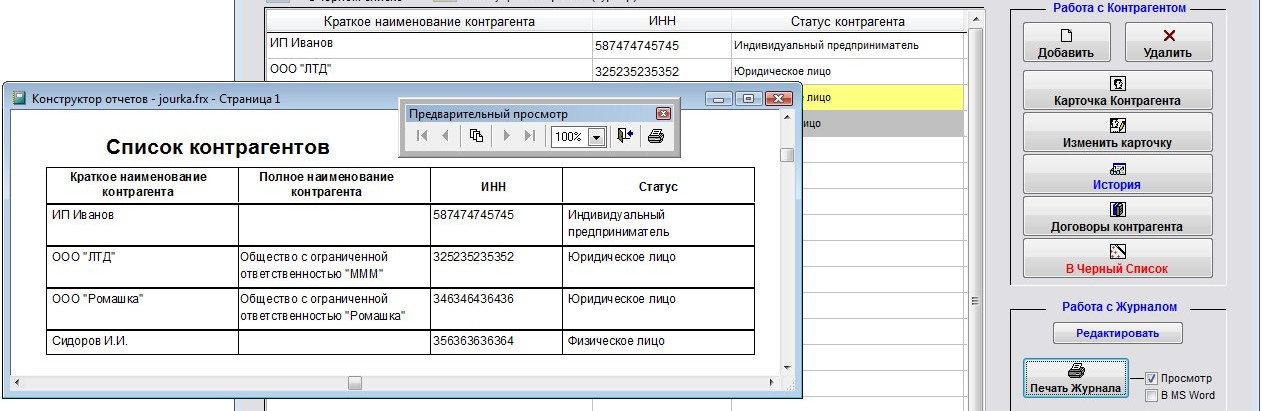 Для вывода журнала контрагентов в установленный Microsoft Word либо, при соответствующей