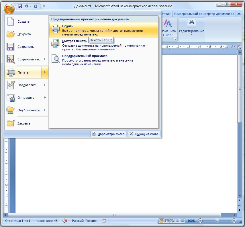 Для печати документа из MS Word либо OpenOffice Writer используйте кнопку с изображением принтера либо пункт меню Файл(Главное меню)-Печать.