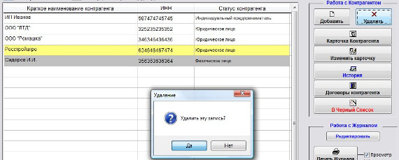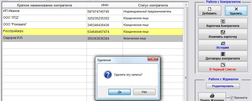Если Вы уверены, что хотите удалить контрагента, нажмите "Да".