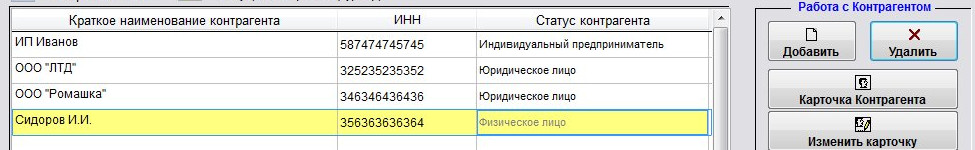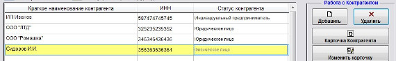 Для удаления нужного контрагента мышью установите на него курсор (контрагент выделится желтым) и нажмите кнопку "Удалить" в правой верхней части формы.