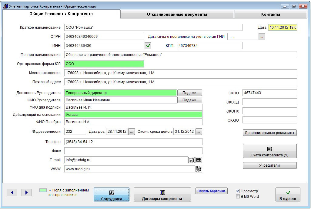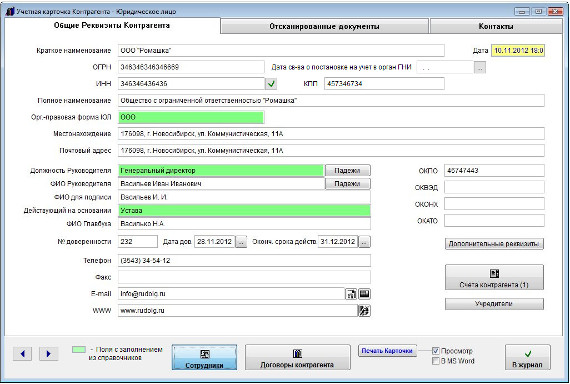 Для введения информации о сотрудниках контрагента в карточке контрагента нажмите кнопку "Сотрудники".