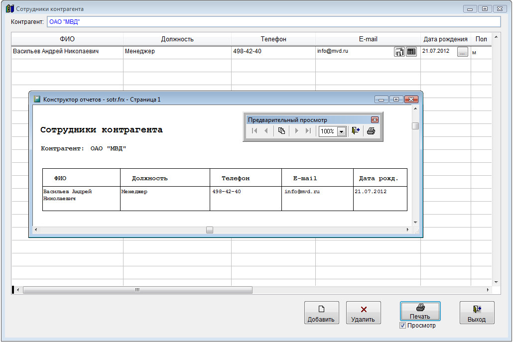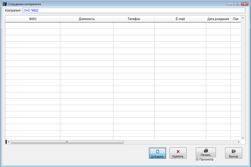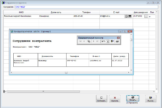 Для печати списка сотрудников данного контрагента нажмите кнопку "Печать" с изображением принтера.