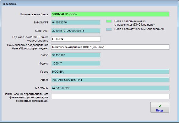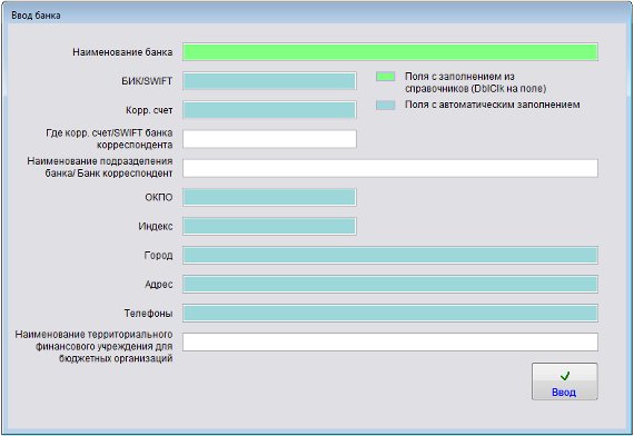 Заполните остальные поля карточки банка, по окончании нажмите "Ввод".