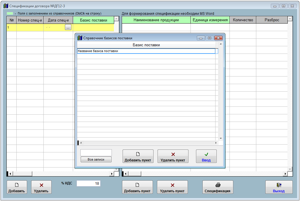 В случае, если поле, заполняемое из справочника, находится в таблице (как, например, поле Базис поставки в разделе Спецификации), то шапка соответствующего столбца выделяется цветом.