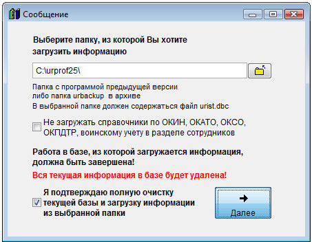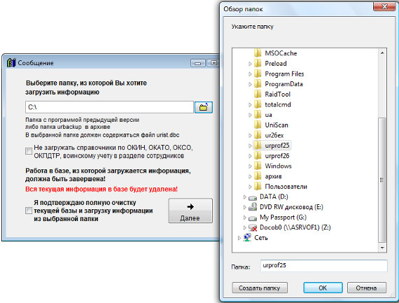 В открывшемся окне нажмите на кнопку с желтой папкой и выберите папку, из которой требуется загрузить информацию, например C:\urprof25