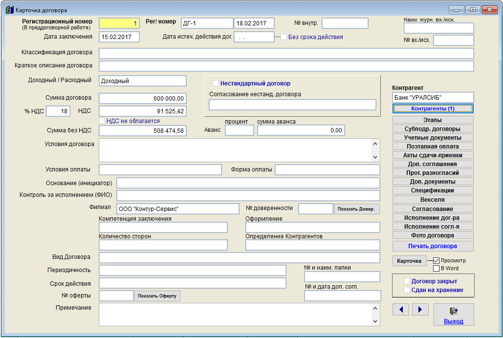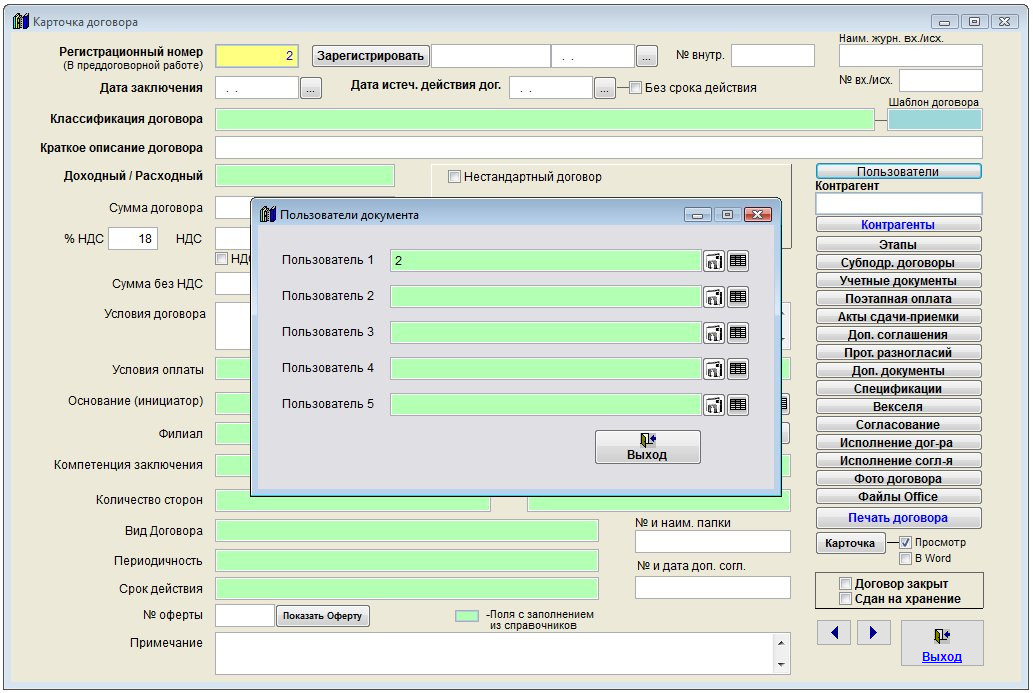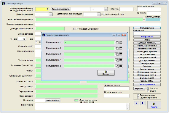 Пользователь, в профиле которого установлена галочка "Видеть только свои документы и контакты", сможет видеть только те документы, у которых он является "Пользователем". Максимально возможно пять "Пользователей" на документ.