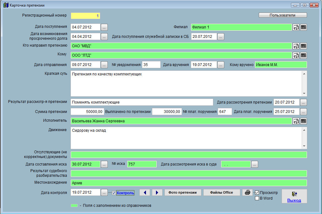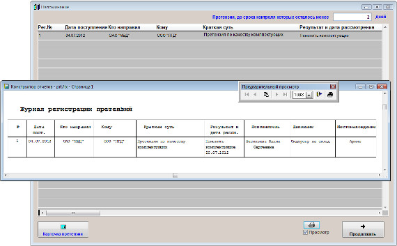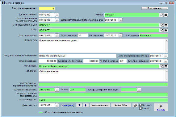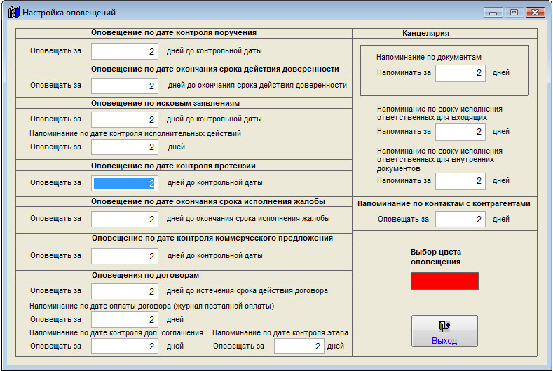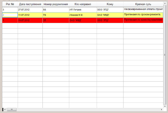 В программе "Юридический офис" можно организовать оповещение по дате контроля претензии при загрузке программы, также по данному критерию существует цветовое оповещение в журнале претензий.