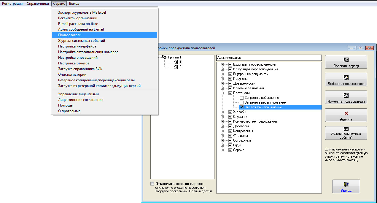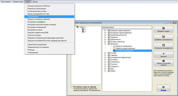 Для этого откройте раздел меню Сервис-Пользователи.