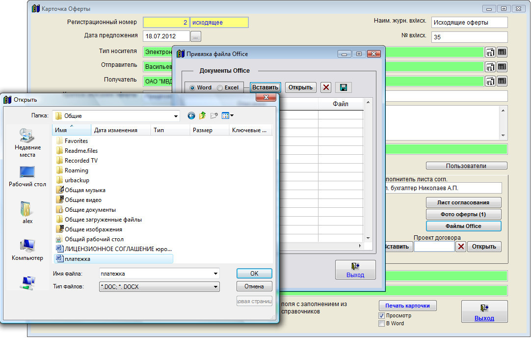 Для прикрепления файлов Word и Excel нажмите кнопку "Файлы Office" в карточке претензии (в нижней части карточки).