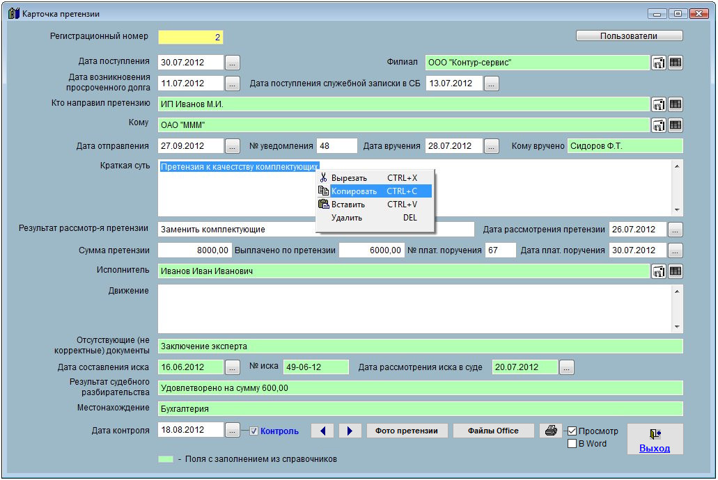 Аналогичным образом копирование/вставка осуществляется в любом разделе программы - карточке претензии, дополнительных журналах, справочниках.