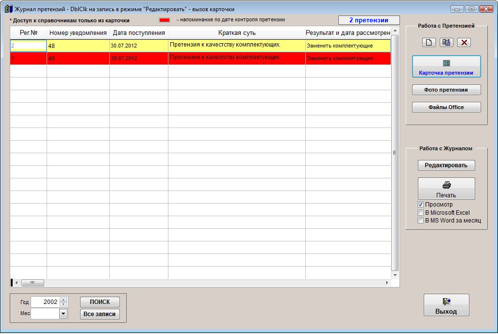 Претензии, у которых просрочена дата контроля и установлена галочка Контроль, выделяются в журнале соответствующим (красным) цветом.