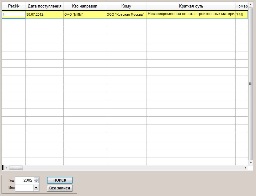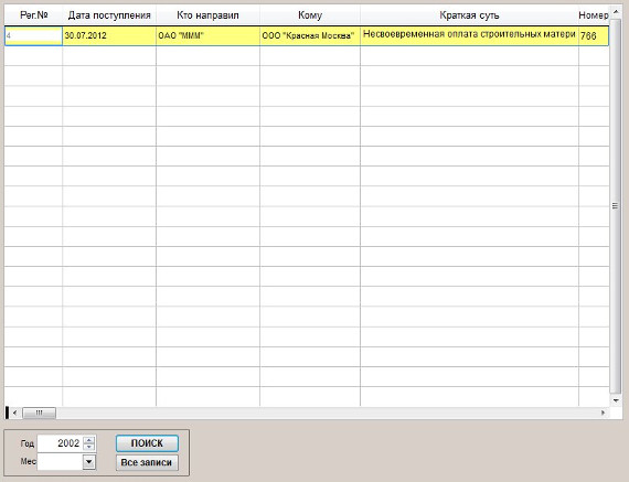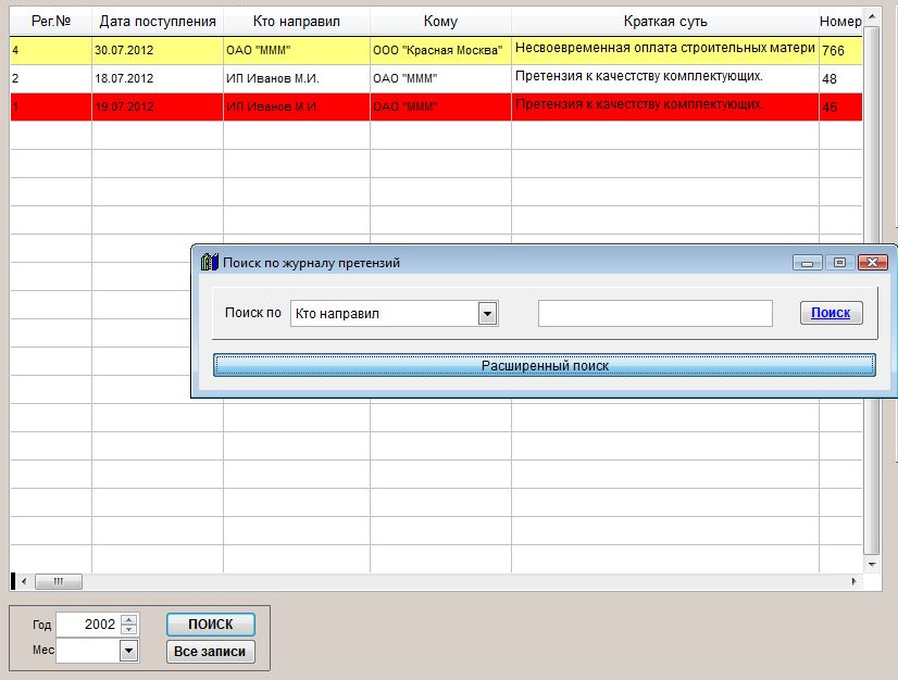 В журнале претензий отобразятся только те записи, которые соответствуют критериям поиска, т.е. все претензии с отправителем ОАО "МММ", с получателем ООО "Красная Москва" и с датой претензии, попадающей в указанный интервал дат.