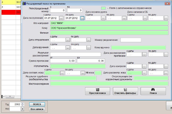 Параметры учитываются при поиске по условию И, т.е. в нашем случае отобразятся все претензии с Отправителем ОАО "МММ", с получателем ООО "Красная Москва" и с датой претензии, попадающей в указанный интервал дат.