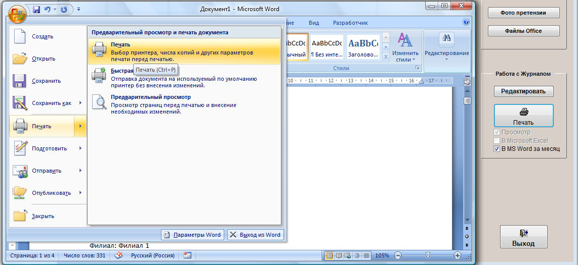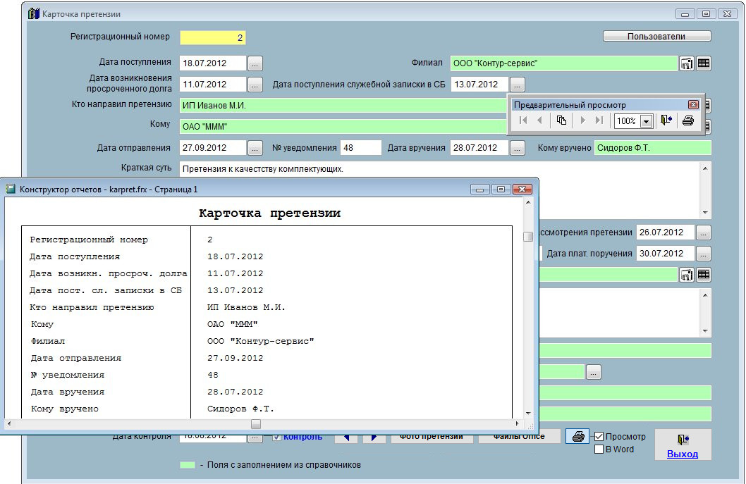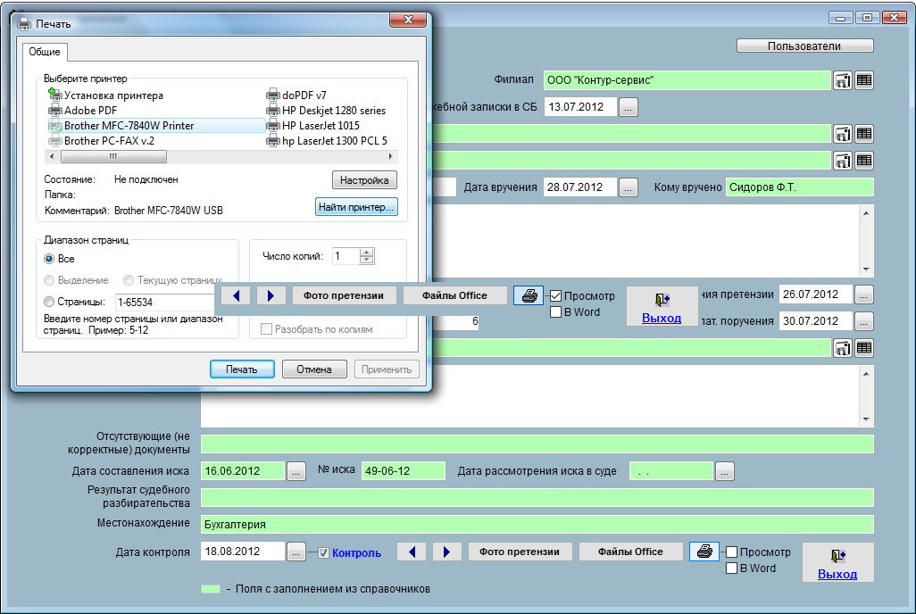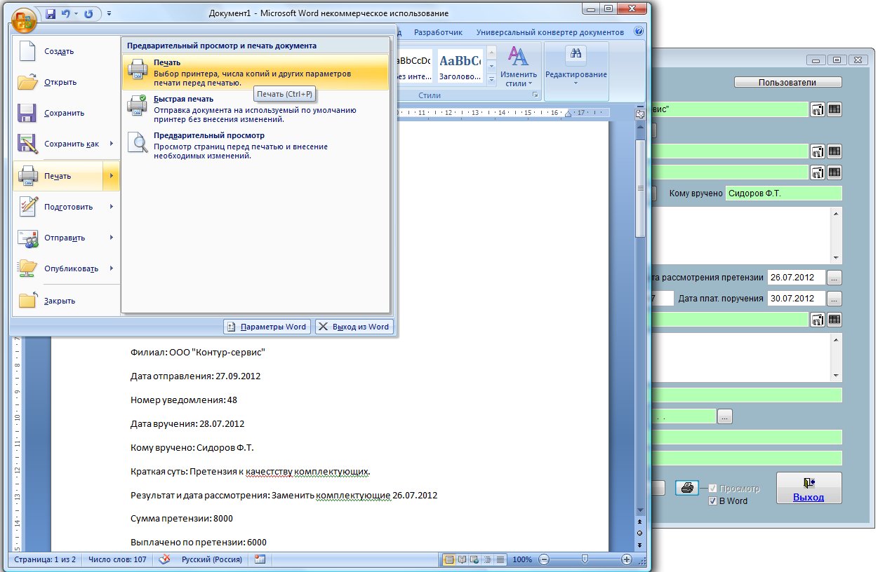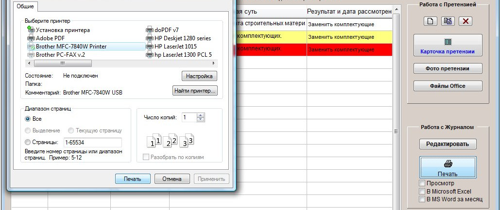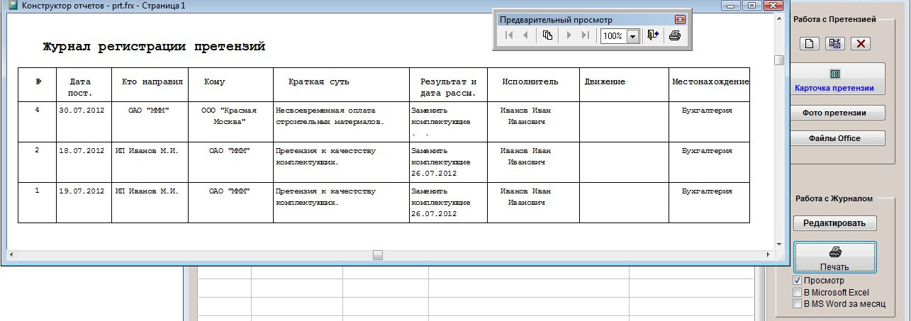 Как вывести на печать или в MS Word (OpenOffice Writer) отдельную претензию и журнал претензий