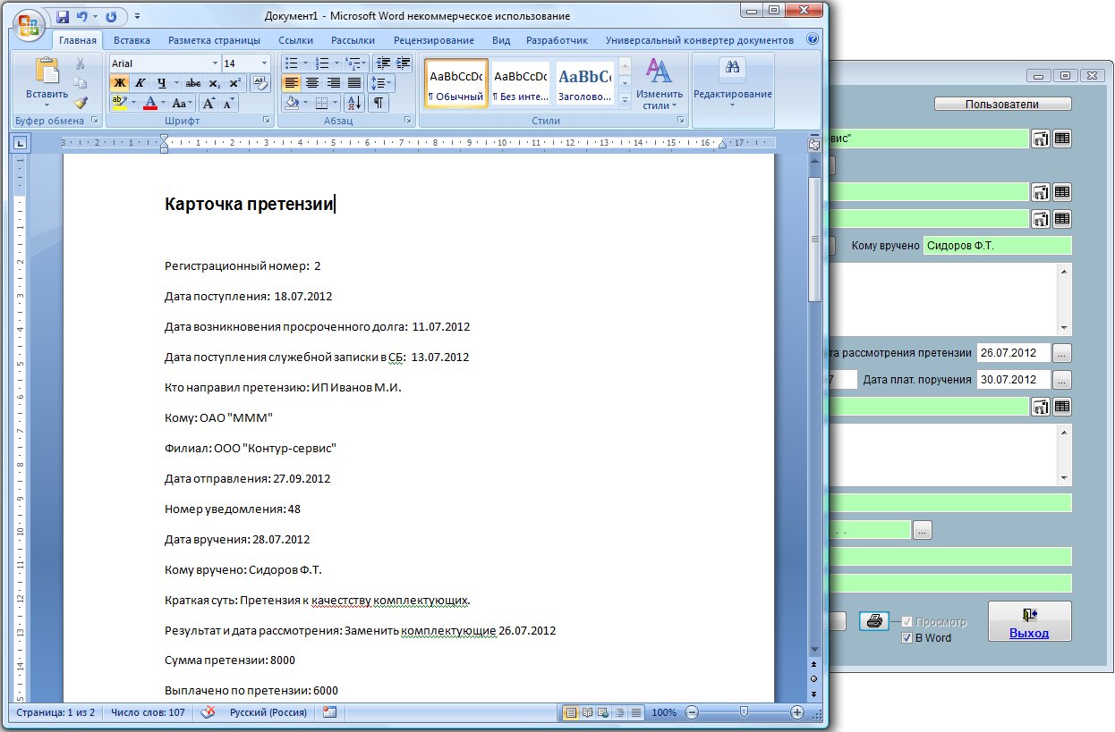 Карточка претензии будет сформирована в MS Word либо, при соответствующей