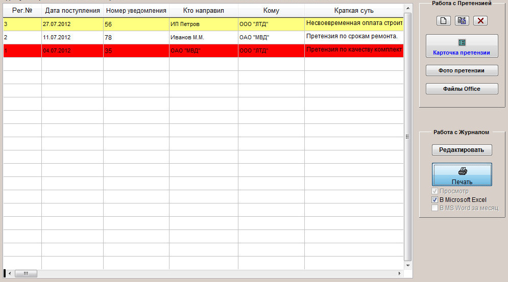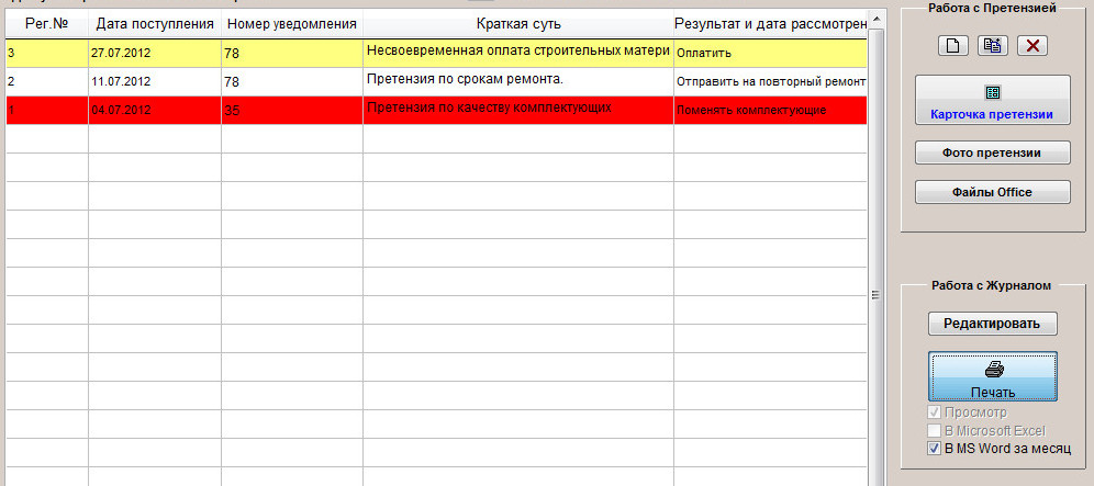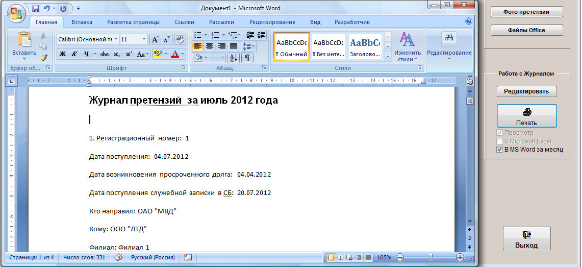 Журнал претензий будет сформирован в MS Word либо, при соответствующей