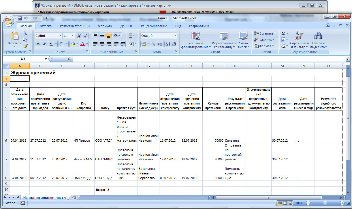 Журнал претензий будет сформирован в MS Excel либо, при соответствующей