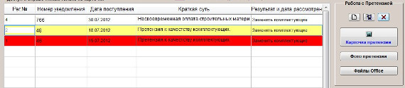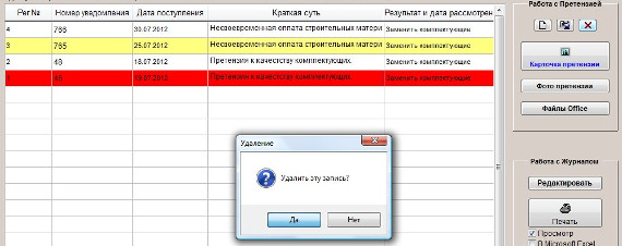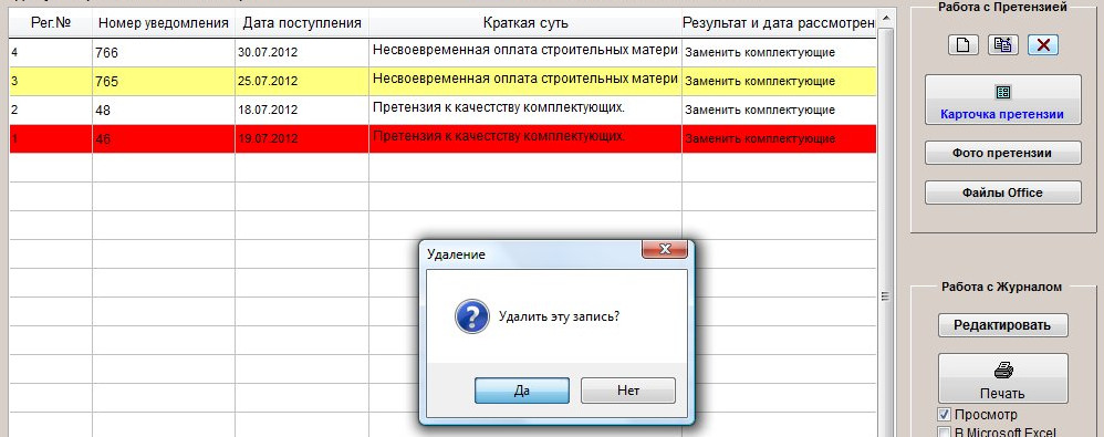 Для удаления претензии в журнале претензий установите курсор на претензию с нужным номером.