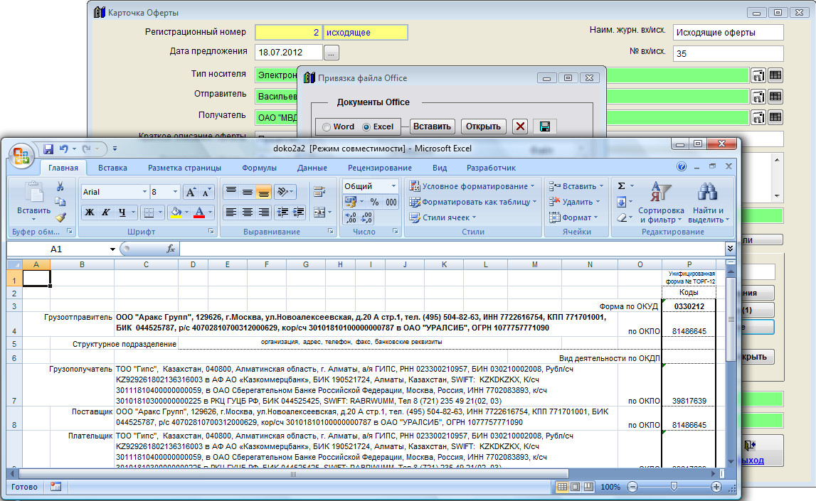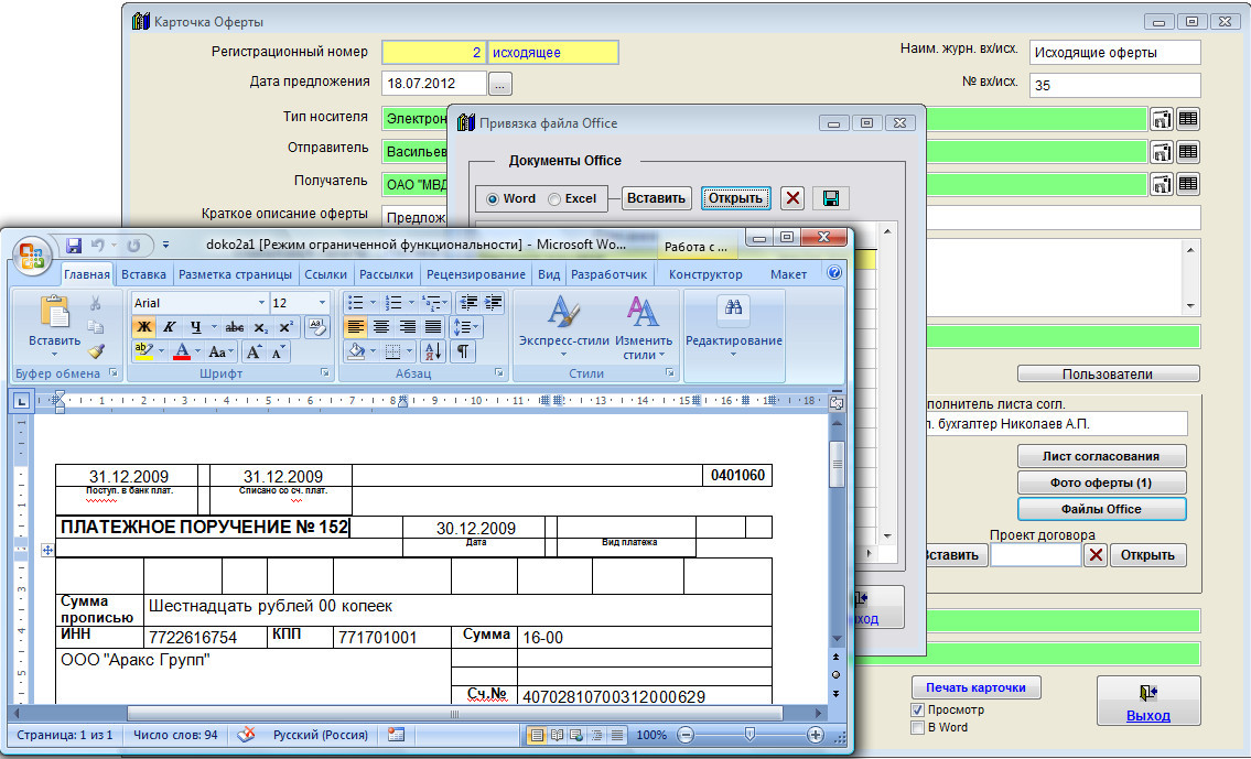 Для просмотра, редактирования и печати прикрепления файлов Word и Excel нажмите кнопку "Файлы Office" в карточке претензии.