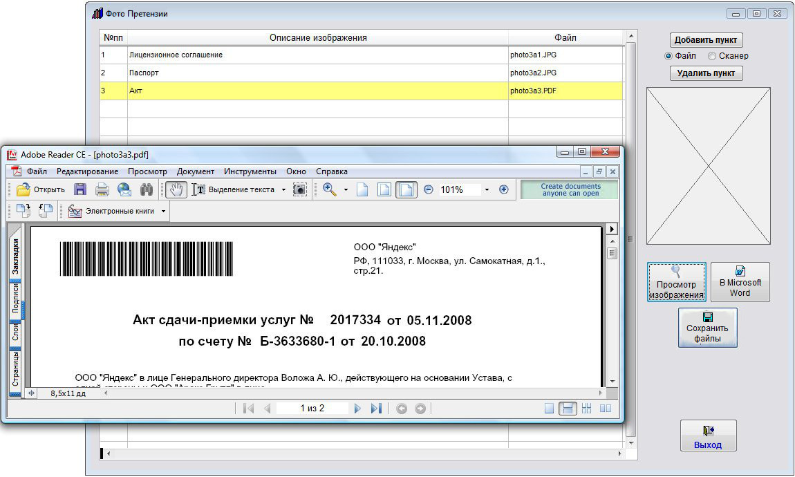 Для просмотра файлов формата PDF в разделе "Фото претензии" нажмите кнопку "Фото претензии".