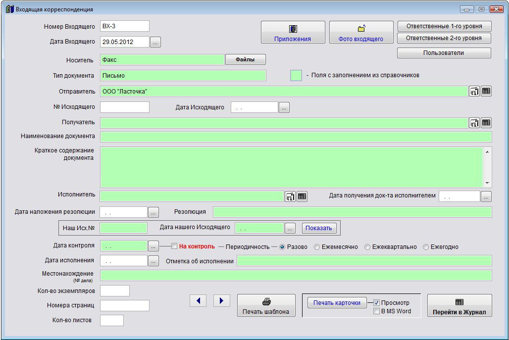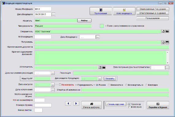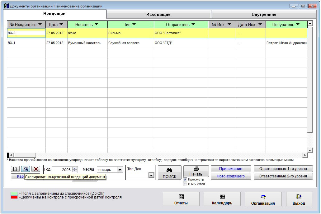 Для копирования документа в журнале входящих документов установите курсор на документ с нужным номером.