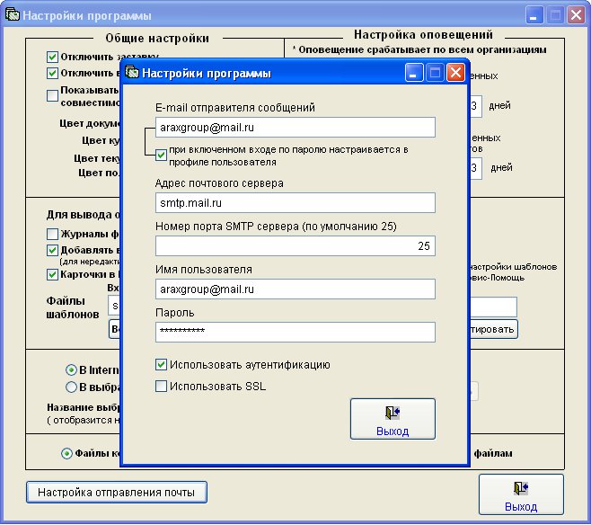 Для настройки возможности уведомлений по e-mail требуется указать в программе параметры используемого почтового сервера.