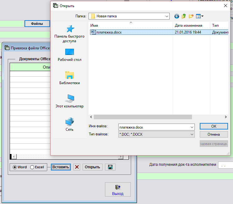 Для прикрепления файла Word выберите опцию "Word" и нажмите кнопку "Вставить".