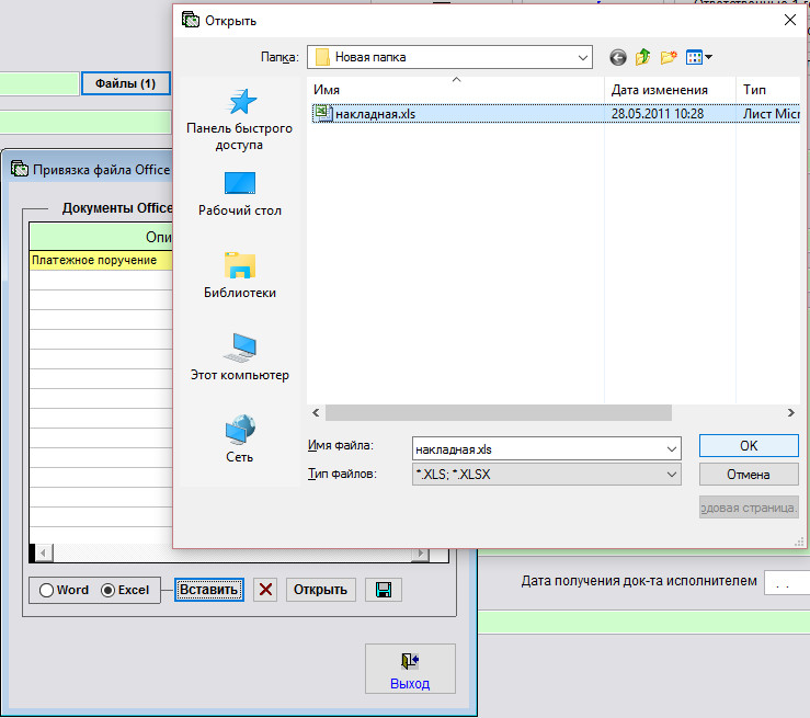 Для прикрепления файла Excel выберите опцию "Excel" и нажмите кнопку "Вставить". Откроется окно обзора файлов.
